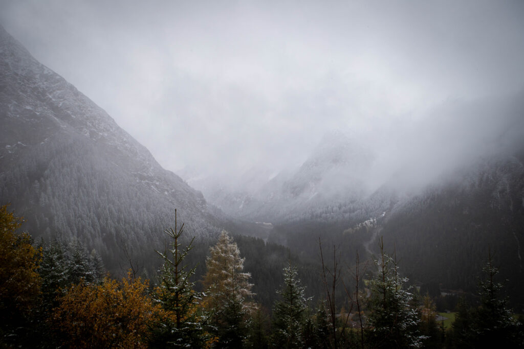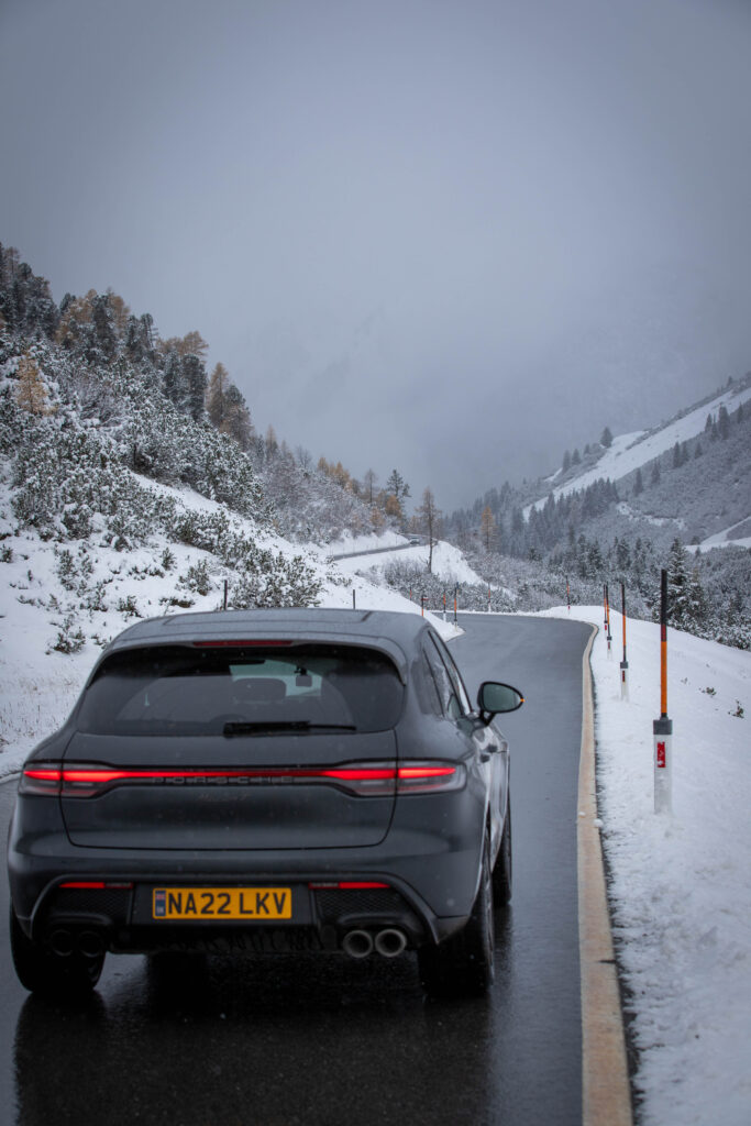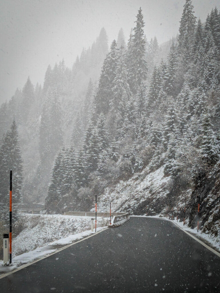 As we neared the Hahntennjoch the weather deteriorated rapidly. Rain turned to snow, which became heavier and as we climbed was settling on the ground and road in more places. The route was incredible though – continually twisting, turning roads, narrow lined with trees, then occasionally a glimpse of the mountains shrouded in cloud. Probably the prettiest route so far.