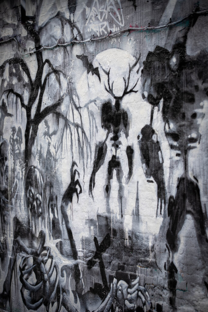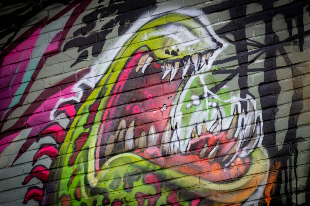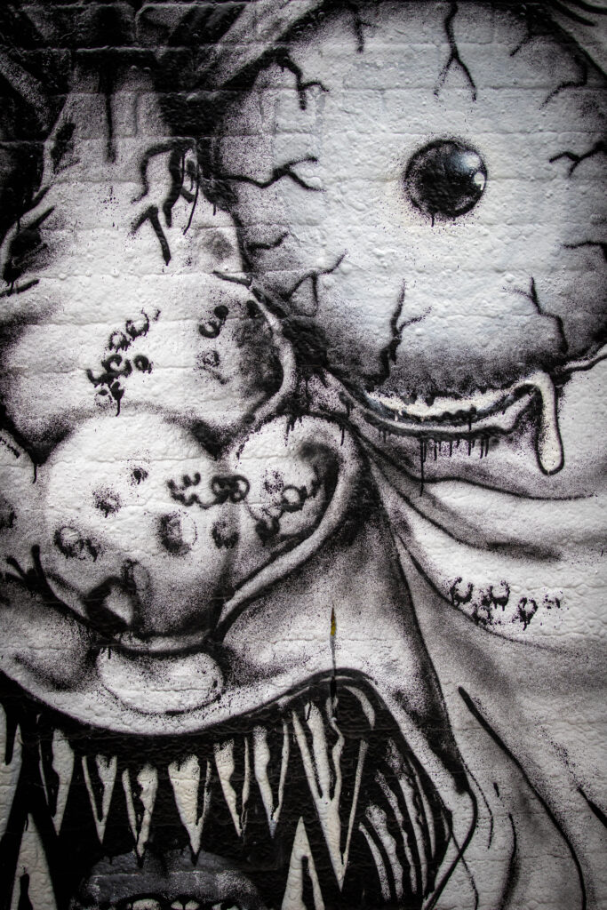 We then headed to “graffiti street”, which quite obviously was a street with walls covered in graffiti. Much of it had been painted over in readiness for fresh artwork to be applied, but some remained and was definitely Halloween themed. Either side of the street we found small shops selling various things.