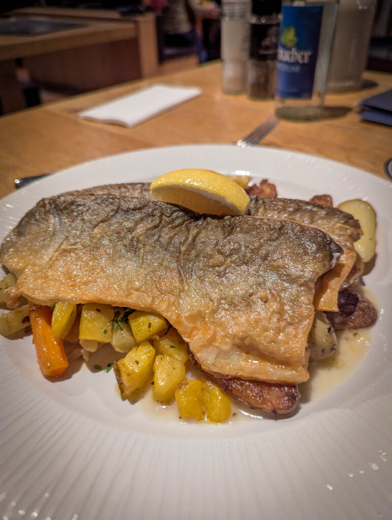 We decided dinner out of the hotel at a local German establishment – we shared an excellent soup with the cheesiest cheese dumpling imaginable, followed by pork shank with dumpling and gravy (no vegetables) and char (fish) on a heap of vegetables. And weissbier (wheat beer). Rest day done.