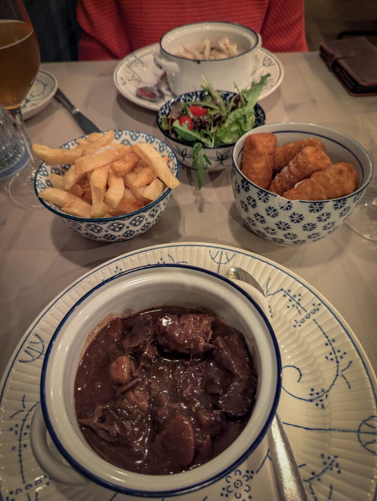 Then it was time for dinner. We’d pre-booked a restaurant the other side of the city which got great reviews, but decided to Uber there and back as we were tired after our run and extended and duplicated walk around Brugge (I was on 20,000 steps, Jo 22,000 by this point). Dinner at Cezar (rated second in Brugge) was fantastic – marrow bone to start, followed by venison stew and vol-au-vent with frites and croquettes, then crème brulée to finish, with Belgian beer of course!